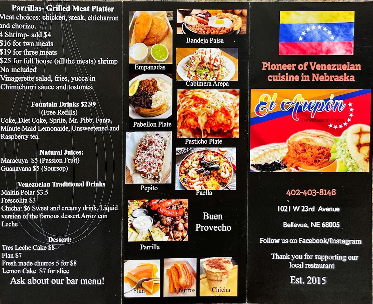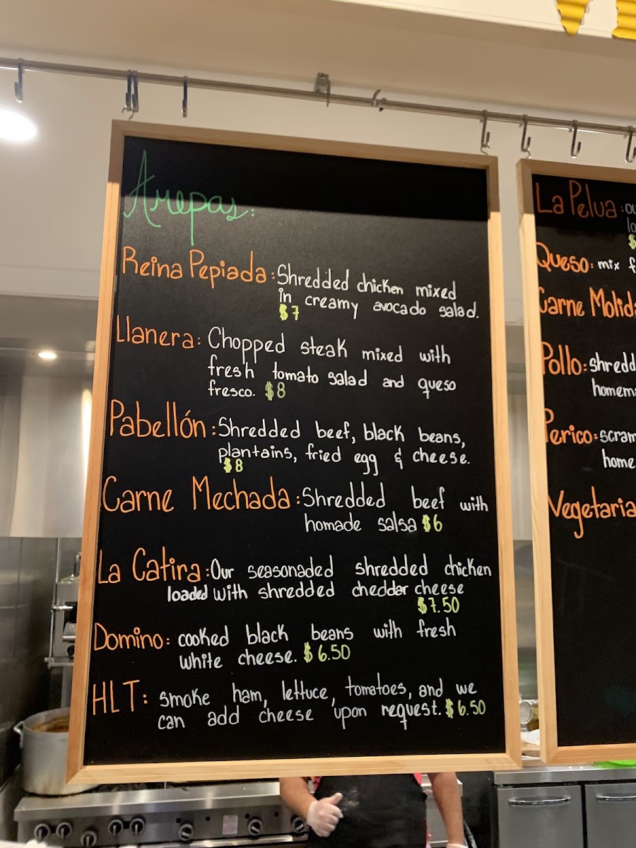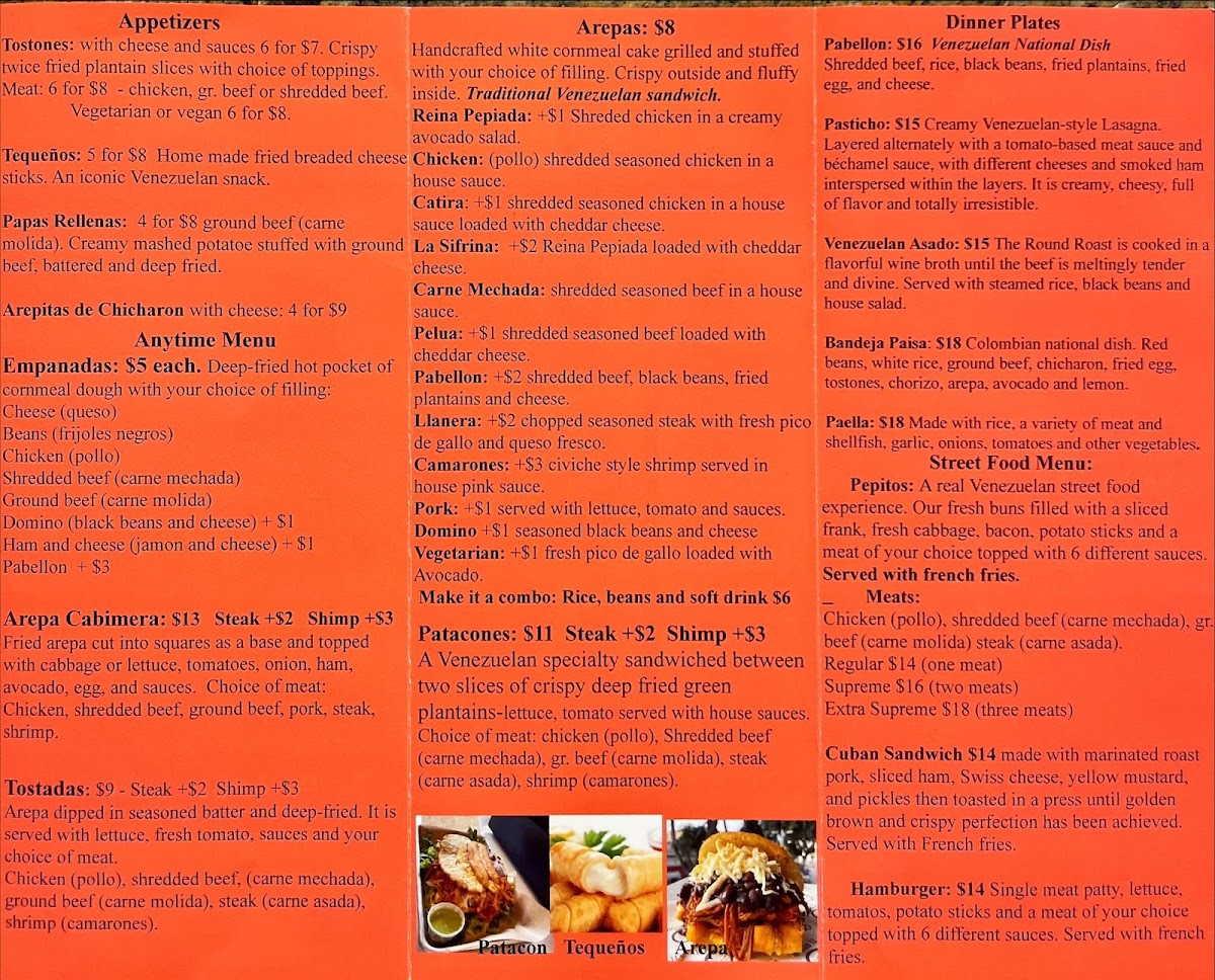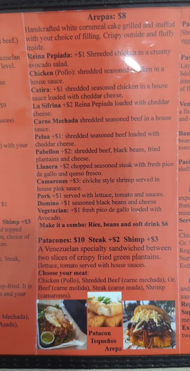 Fried arepa cut into squared as a base and topped with cabbage or lettuce, tomato, anion you choice of meat, ham, egg and sauces