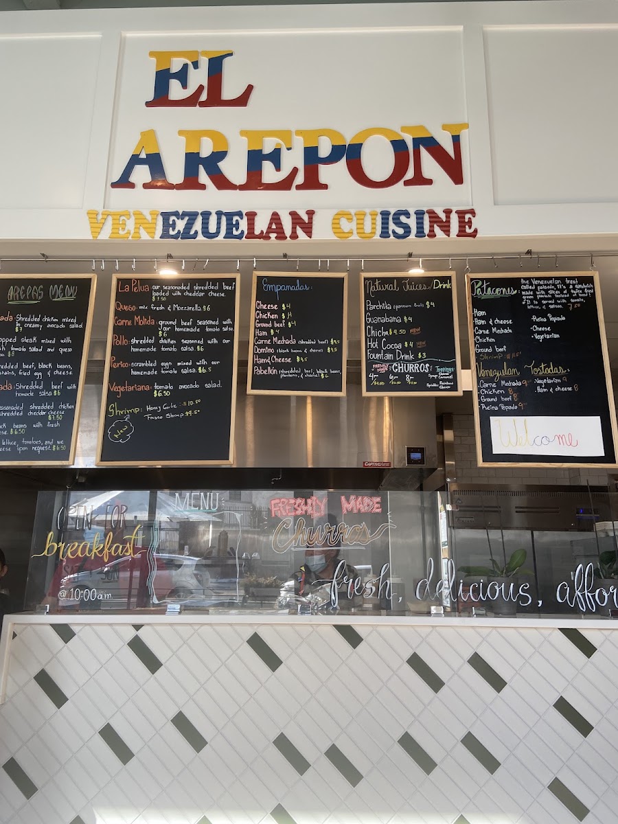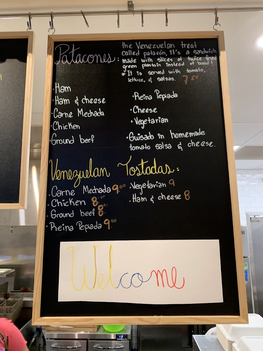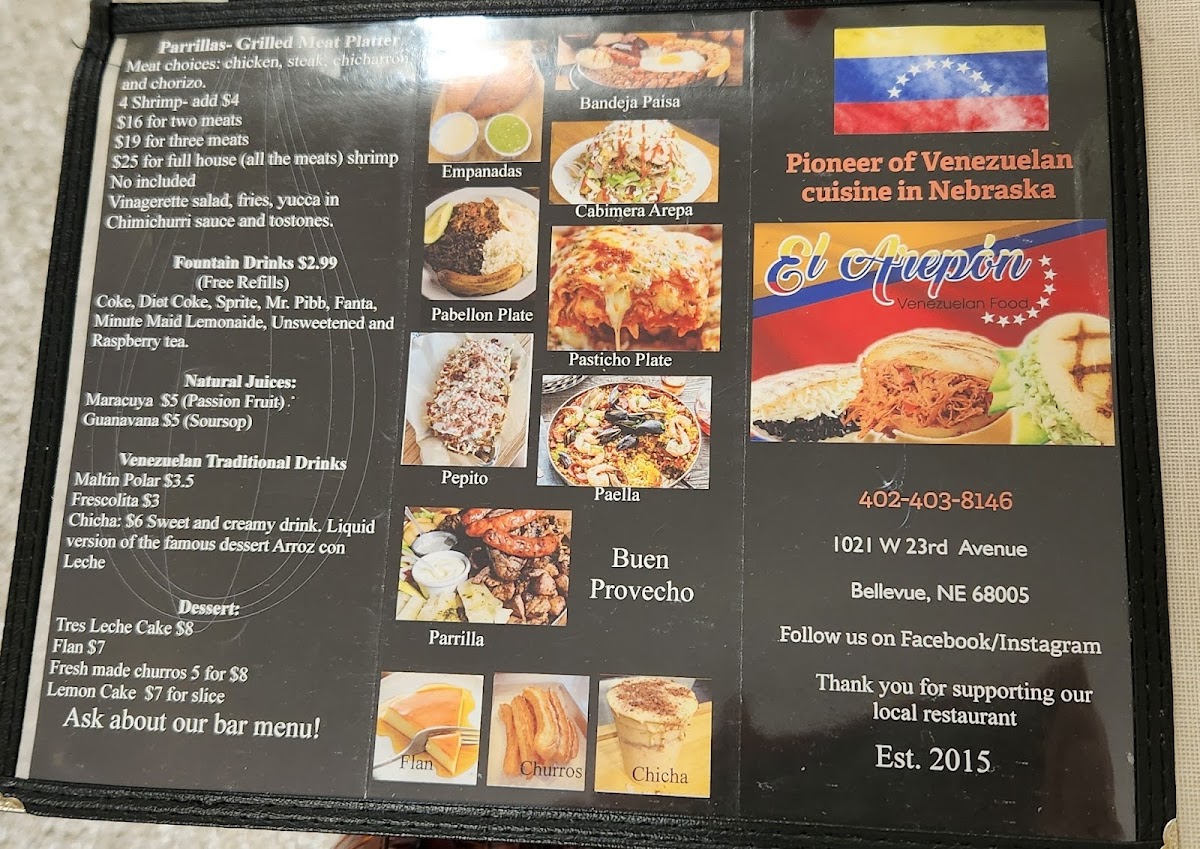 Fried arepa cut into squared as a base and topped with cabbage or lettuce, tomato, anion you choice of meat, ham, egg and sauces