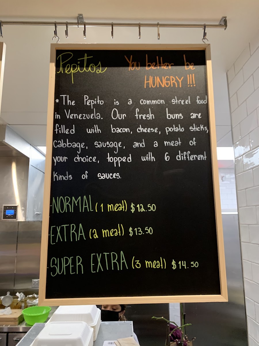 A real Venezuelsn street food expirience. Our fresh buns filled with a sliced frank, fresh cabbega, becon, potatos sticks, cheese and the meat of your choice topped with six different sauces.